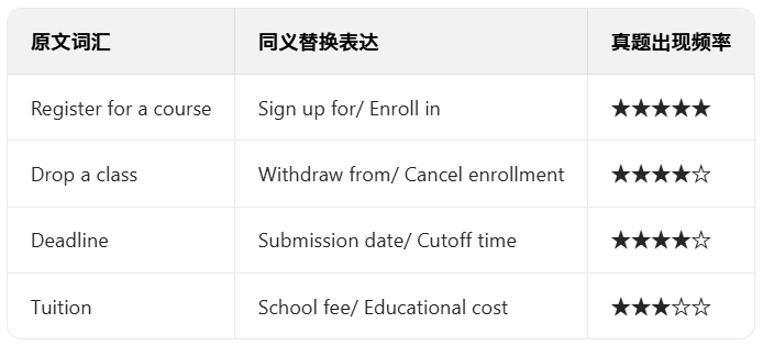 真题案例:原文:"The professor emphasized the significance of taking notes."选项:"The professor stressed the importance of note-taking."("Emphasized"→"Stressed","Significance"→"Importance")